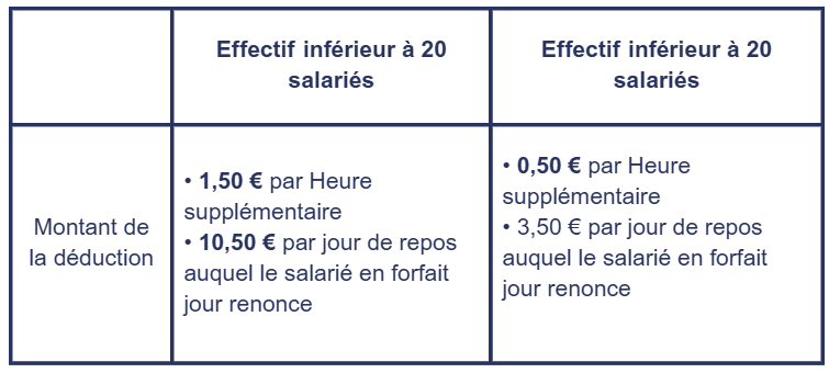 Pour rappel, les employeurs comptant un effectif inférieur à 250 salariés bénéficient d’une déduction forfaitaire sur les heures supplémentaires réalisées par leurs salariés ou sur les jours de repos auxquels les salariés en forfait jour renoncent. Le montant de cette déduction varie en fonction de l’effectif de l’entreprise.