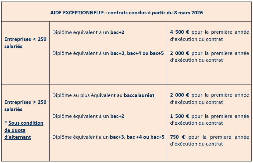 Cette aide concerne les contrats conclus à partir du 8 mars 2026 et débutant avant le 1er janvier 2027.
